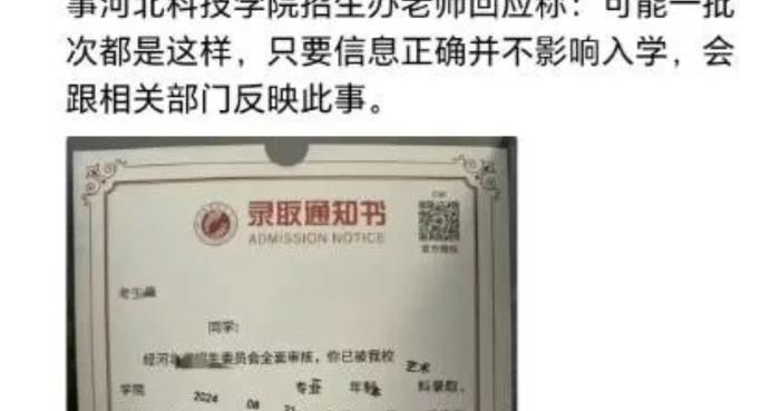 河北科技学院被曝录取通知书多处文字印刷歪斜!校方称已重发